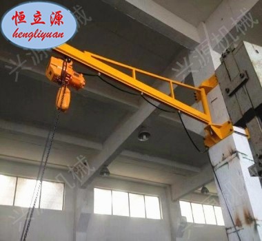 墻壁式旋臂起重機(jī)是根據(jù)用戶需要設(shè)計(jì)的專用起重設(shè)備。具有結(jié)構(gòu)新穎、合理、簡(jiǎn)單、操作使用方便、回轉(zhuǎn)靈活、自重輕、載荷移動(dòng)靈活等優(yōu)點(diǎn),是節(jié)能的物料吊運(yùn)裝備??蓮V泛利用于廠礦、車間的生產(chǎn)線、裝配線和機(jī)床的上下活及倉(cāng)庫(kù)、碼頭等場(chǎng)合的重物吊運(yùn)。墻壁式旋臂起重機(jī)(墻壁吊)由支架、旋臂裝置及環(huán)鏈電動(dòng)葫蘆等組成。懸臂固定在墻壁或水泥柱上,可根據(jù)用戶需求進(jìn)行回轉(zhuǎn)?;剞D(zhuǎn)部分分為手動(dòng)回轉(zhuǎn)和電動(dòng)回轉(zhuǎn)。環(huán)鏈電動(dòng)葫蘆安裝在懸臂軌道上,用于起吊重物。本機(jī)主要由:懸臂、回轉(zhuǎn)裝置、環(huán)鏈電動(dòng)葫蘆組成。環(huán)鏈電動(dòng)葫蘆有起重和在橫梁上往復(fù)運(yùn)行的功能。懸臂梁可由回轉(zhuǎn)裝置上的的減速機(jī)帶動(dòng)滾輪進(jìn)行回轉(zhuǎn)運(yùn)動(dòng)。電器控制箱安裝在環(huán)鏈葫蘆上。本機(jī)操作通過手電門按鈕實(shí)現(xiàn)。手電門有八個(gè)按鈕,分別控制快升、快降、慢升、慢降、左右回轉(zhuǎn)及葫蘆小車的水平前后行走。