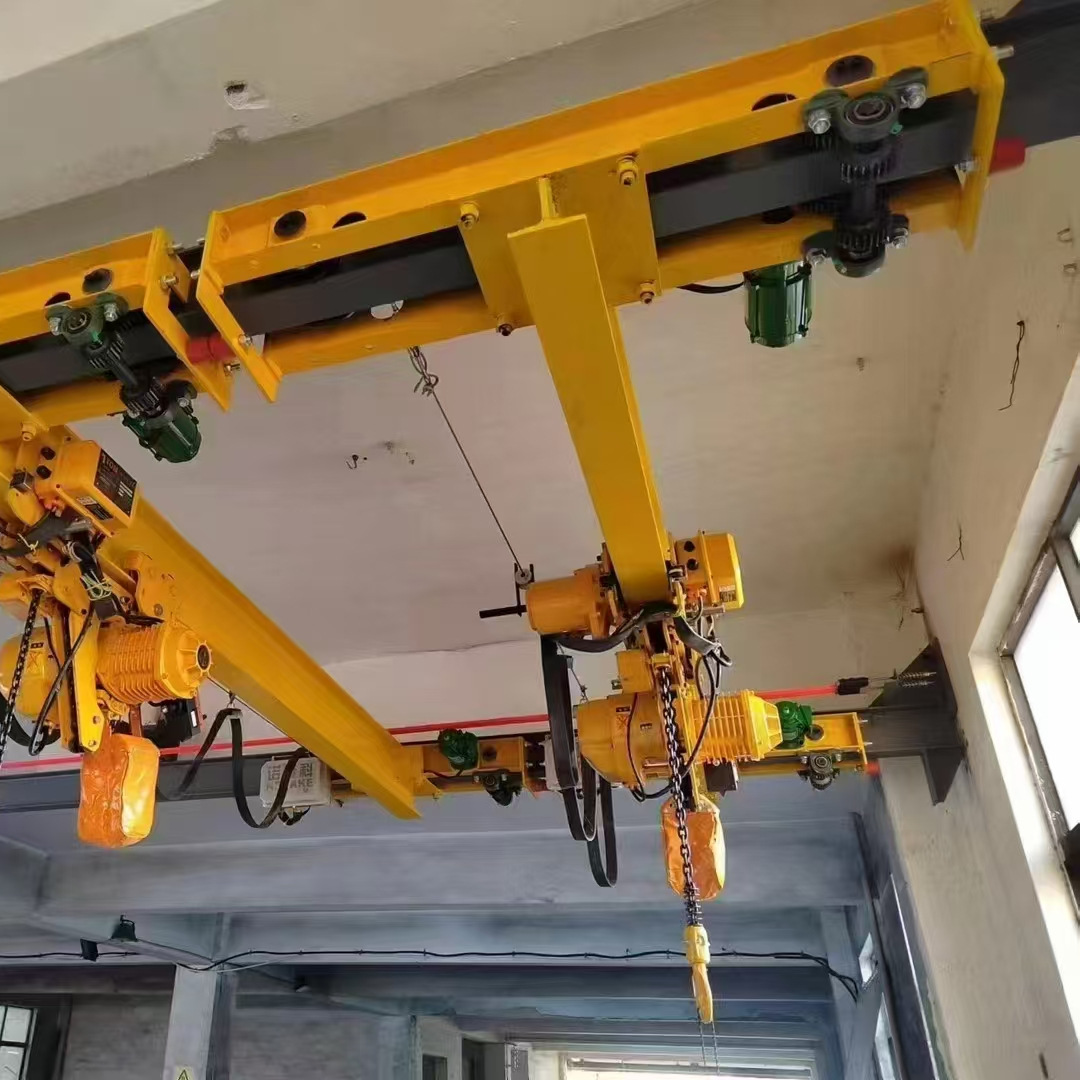 與CD1、MD1型電動(dòng)葫蘆配套使用,構(gòu)成有軌運(yùn)行的單梁起重機(jī)。該懸掛起重機(jī)的運(yùn)行軌道使用用工字鋼,主梁兩端懸掛于工字鋼下方前后運(yùn)行,是小噸位起重設(shè)備。